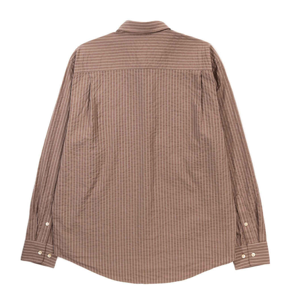 POINTED COLLAR SHIRT WITH SLIGHTLY CURVED HEM, TWO-HOLE MOTHER-OF-PEARL BUTTONS, AND TWO BACK PLEATS. IT FEATURES A SLIGHTLY OVERCUT SHOULDER AND A LOOSE FIT AROUND THE BODY. MADE FROM A STRIPED SEERSUCKER ORGANIC COTTON FABRIC