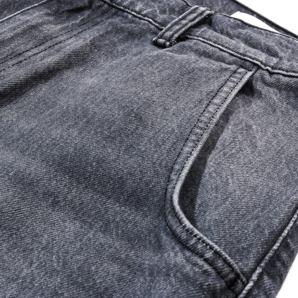 The Straight Cut Jeans have a relaxed straight fit with a mid-rise. Made with side pockets, rear patch pockets, metal button closure and YKK zip fly. Cut from a washed organic cotton denim in a worn grey.