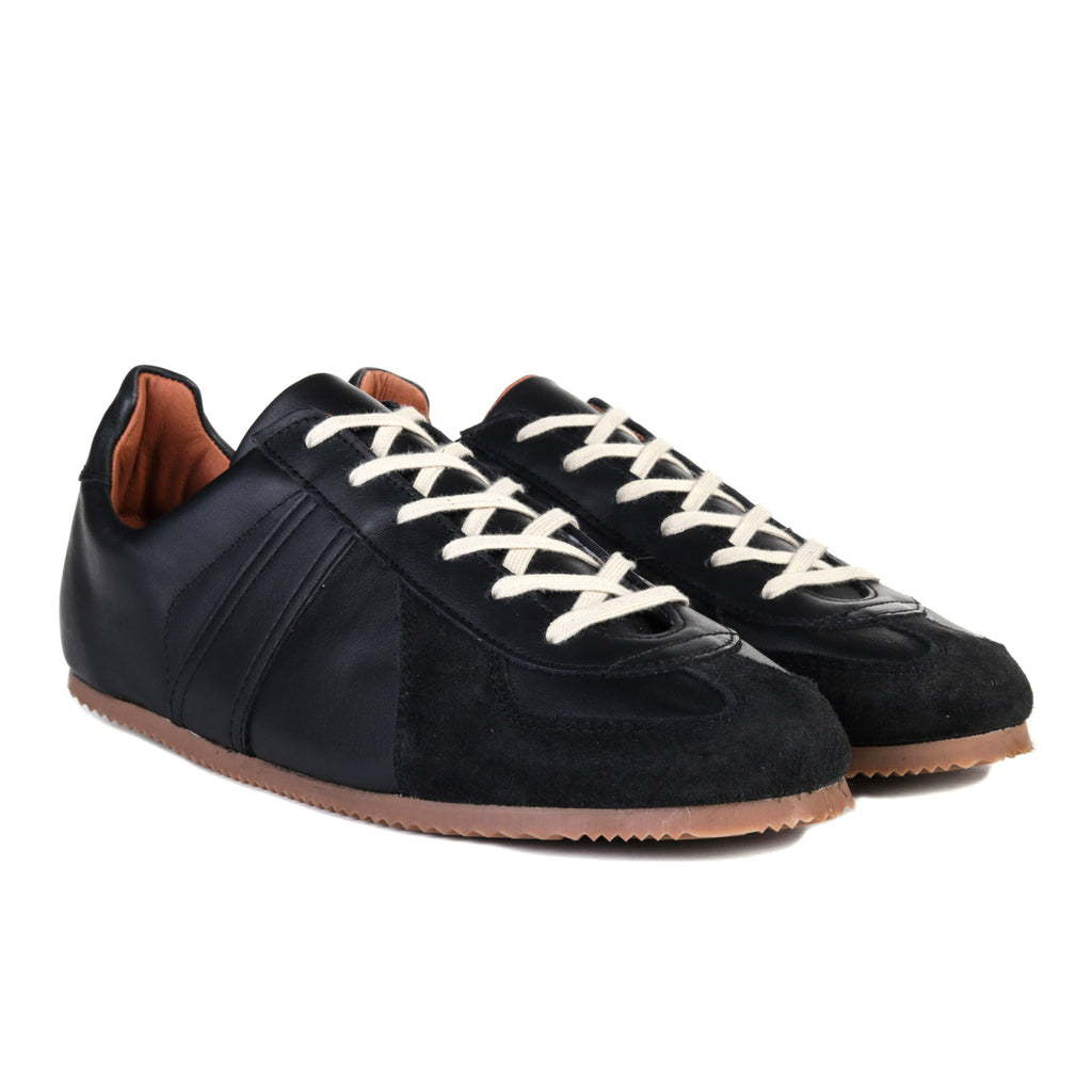 MODELED AFTER THE GERMAN MILITARY SNEAKER OF 1980. TOP STITCHED TOE CAP WITH RUBBER SOLE. LEATHER INSOLE THAT TAKES CONTOUR TO THE WEARERS FOOT.