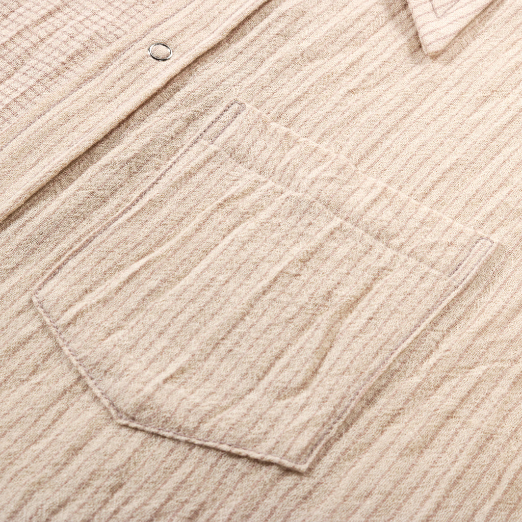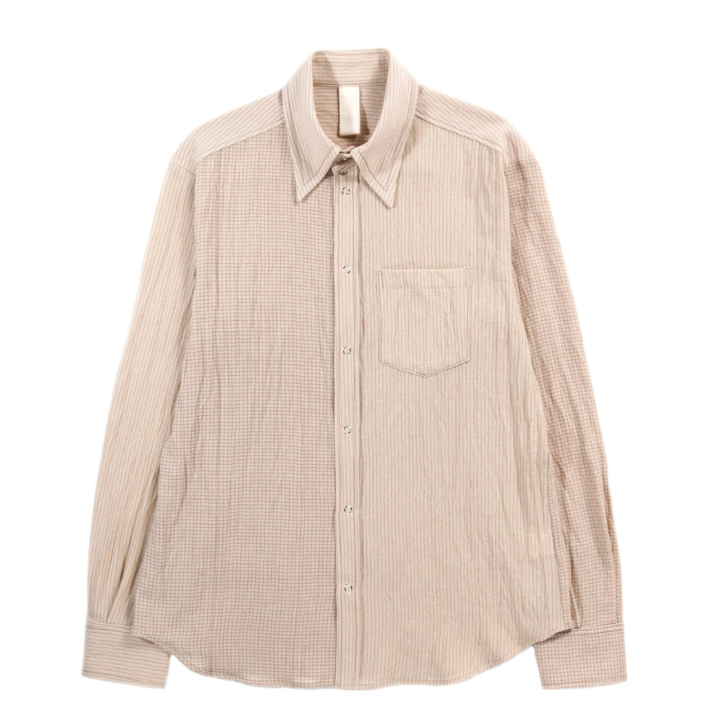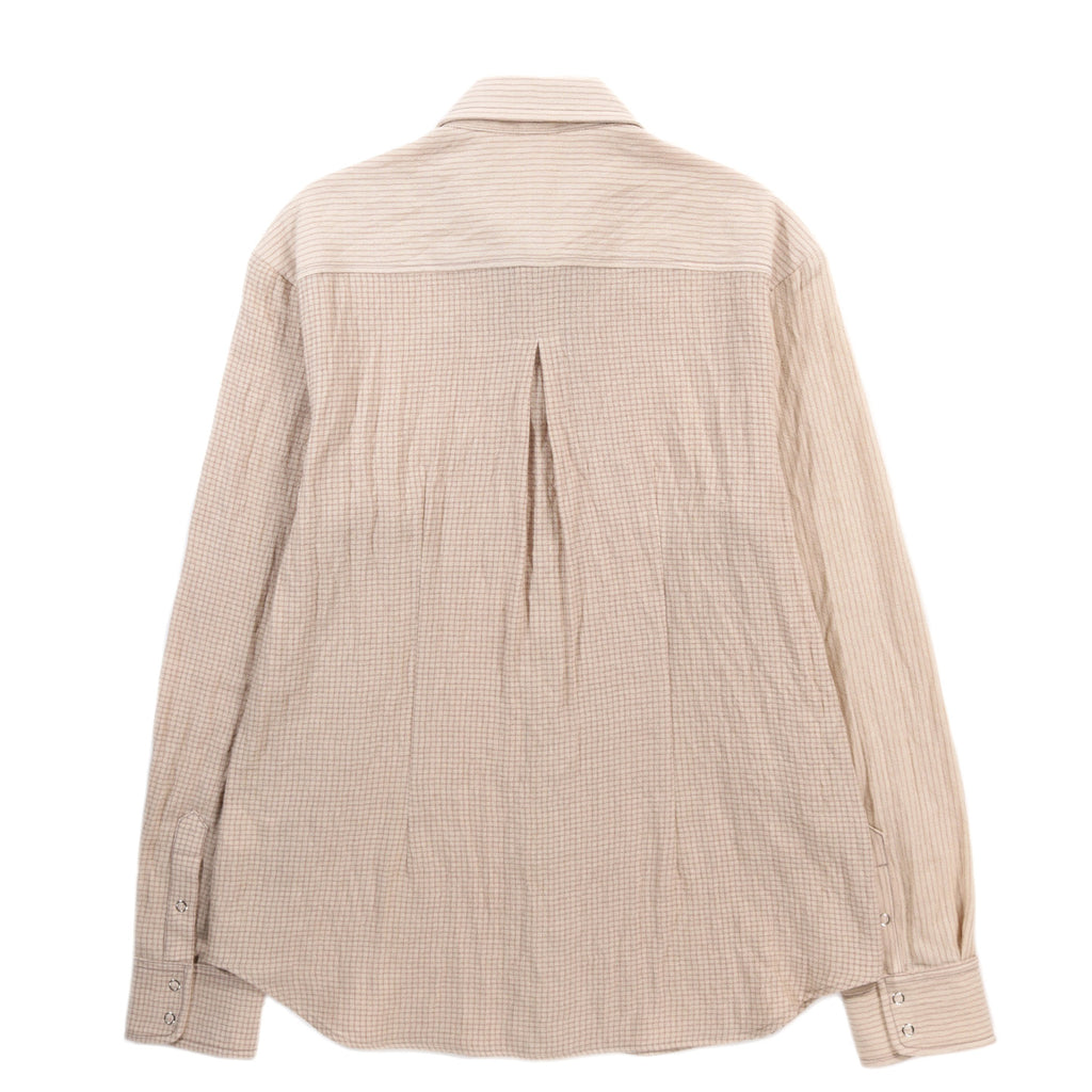 Snap front shirt constructed in a wool/cotton gauze fabric from Japan. Dry yet soft hand feel and a matte-like texture give the shirt a comfortable wear. The shirt is paneled using slightly different qualities of the same fabric, using the check and stripe iterations to give a subtly playful appearance. The shirt features a spear-point collar and an inverted box pleat on the back yoke with a triangle top-stich closure.