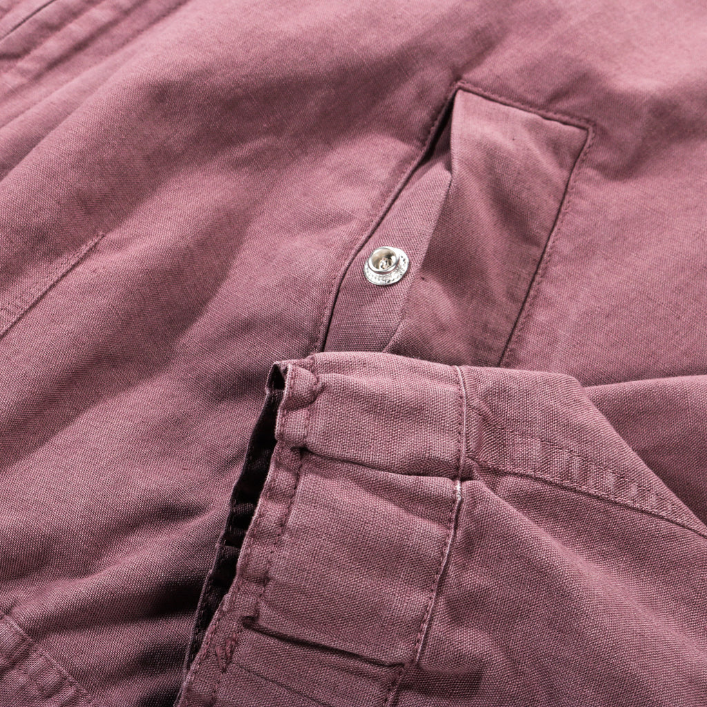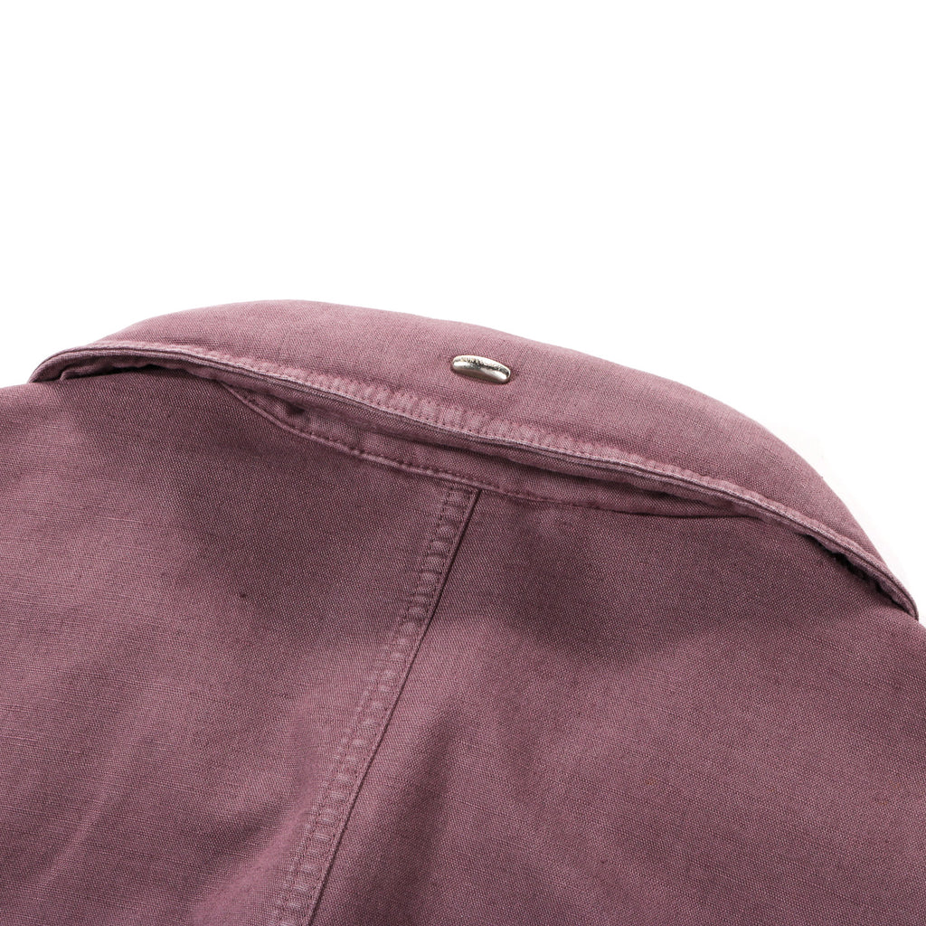 Our Legacy Command Jacket in Port Soft Coat. Produced in a piece dyed cotton, linen and polyurethane blend fabric, the Command Jacket is built on a bomber silhouette with a short body, darted details and elasticated cuffs and hem. It features a rounded collar with an under-collar zip that conceals a contrast fabric hood, a front zipper hidden by a grown-on bumper, and a double zip guard that snaps together to allow the jacket to be worn closed without fastening the zip for a layered look. Additional details include frogmouth welt pockets with snaps and stitched-through darts running into the elasticated hem and cuffs.