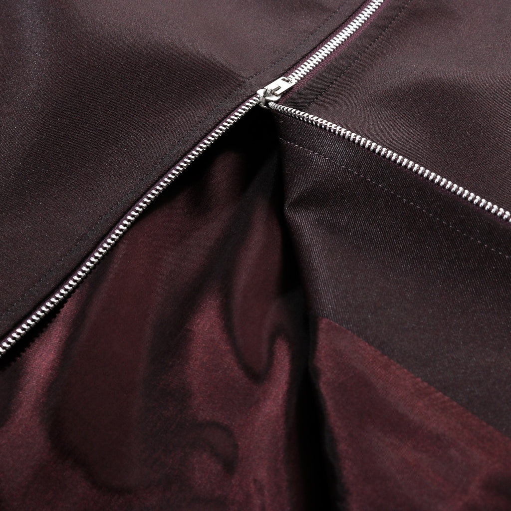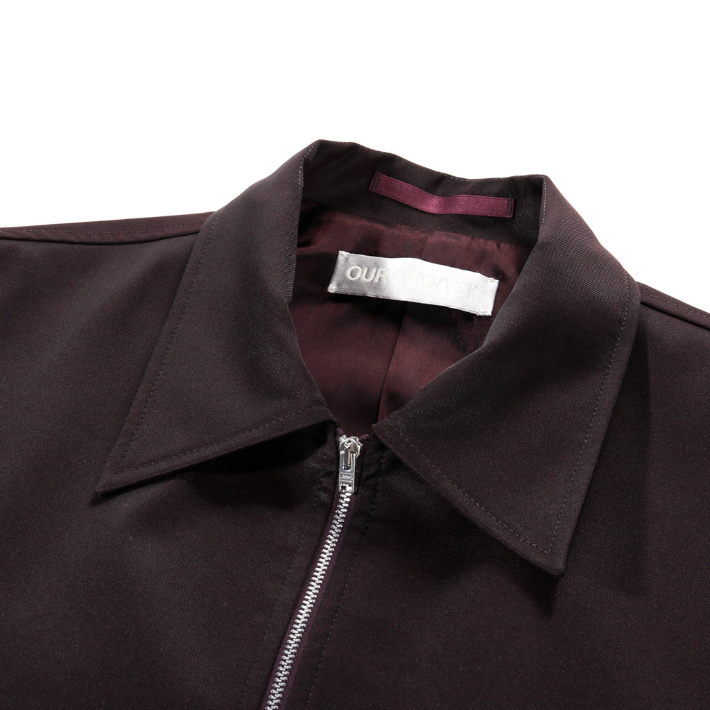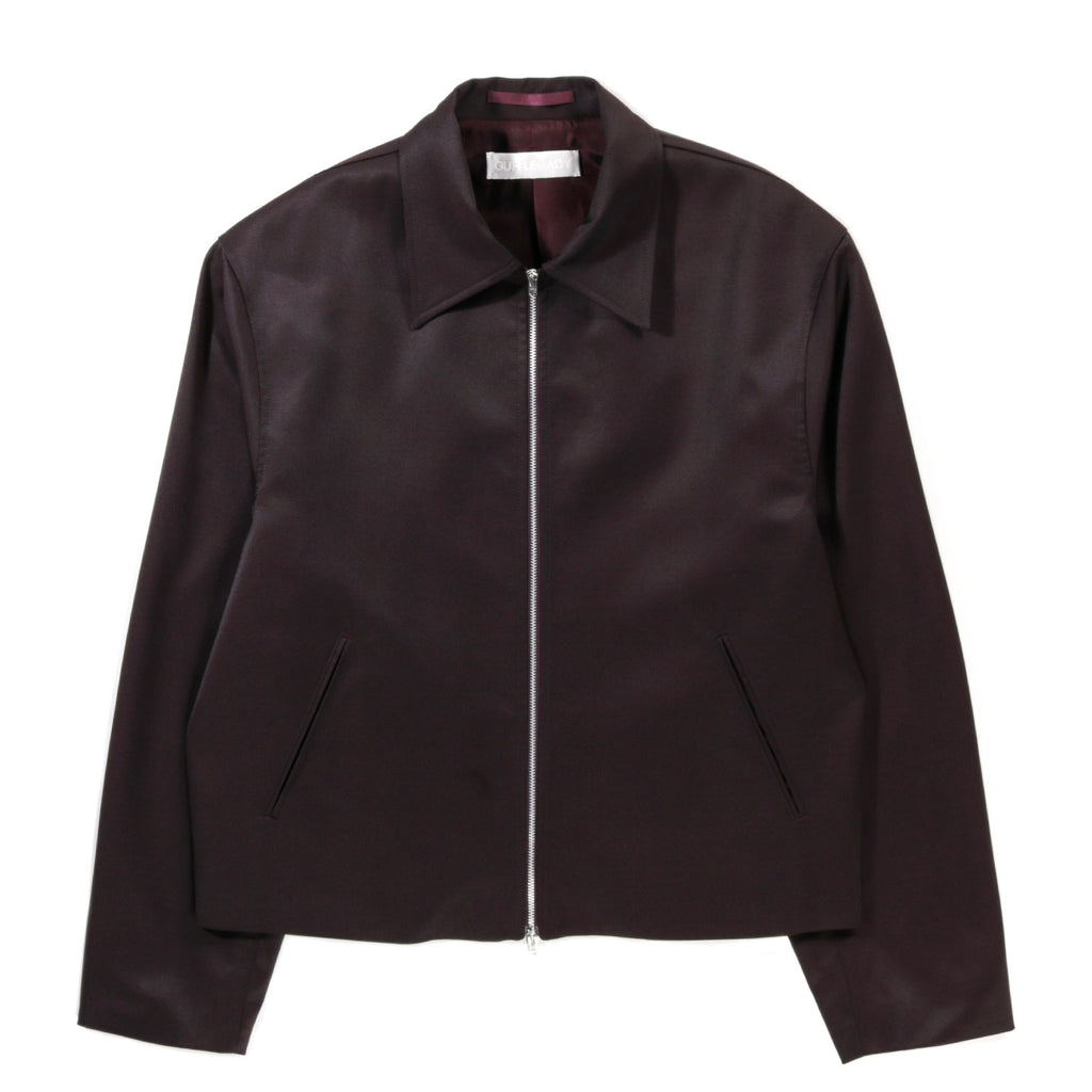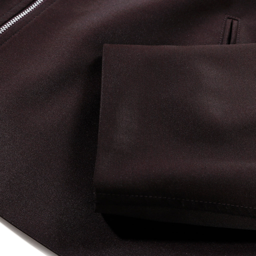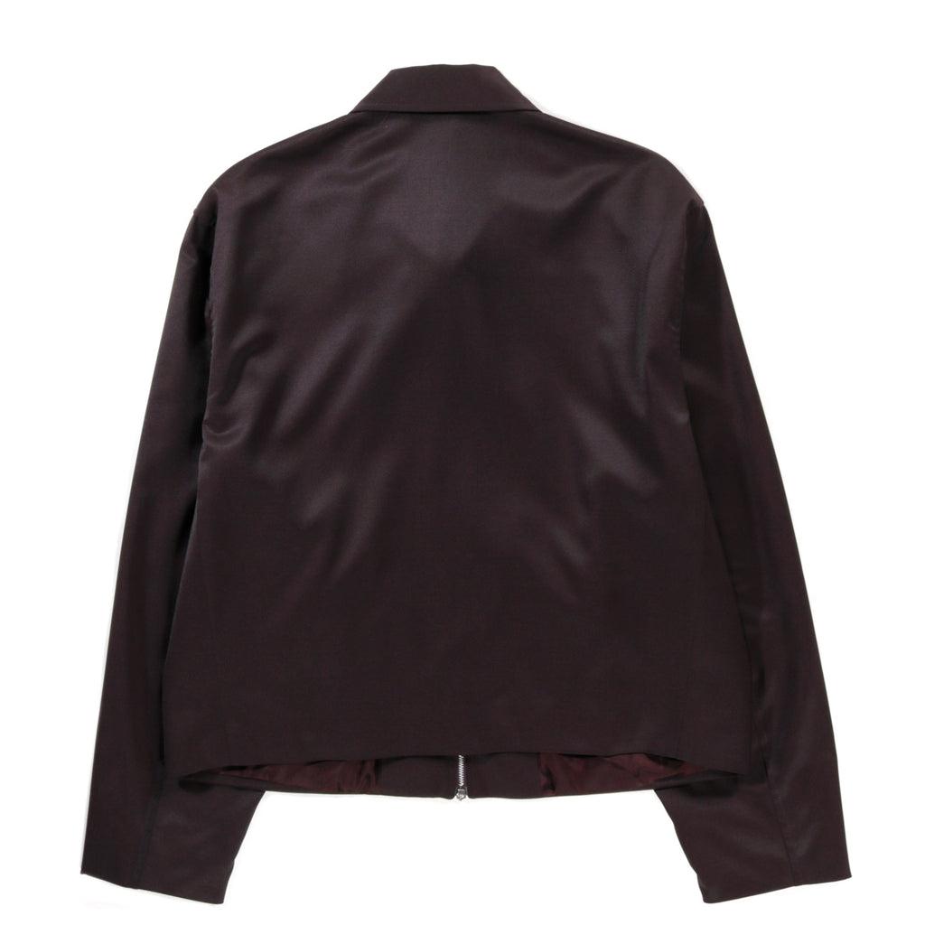 Our Legacy Mini Jacket in Crushed Grape Formflex Weave. Produced in an Italian polyester, virgin wool and elastane blend fabric. The virgin wool provides natural insulation and softness, while polyester enhances durability and resistance to wear. Elastane adds flexibility for comfort and ease of movement. The Mini Jacket has a minimalist, boxy fit and features full lining, a RiRi two-way zip and jet front pockets.