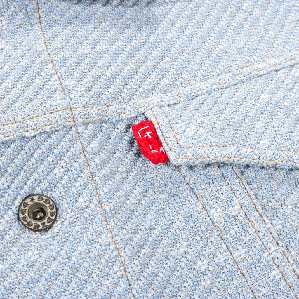 Reknitting vintage. A Levi’s style Type III jacket reconstructed in knit using over five yarns to mimic twill texture with a unique structure. The rare fabric, made on a modified knitting machine found only in Japan, doesn’t fray when cut and handles like woven cloth. Chest pockets feature hand-crocheted red selvedge details.