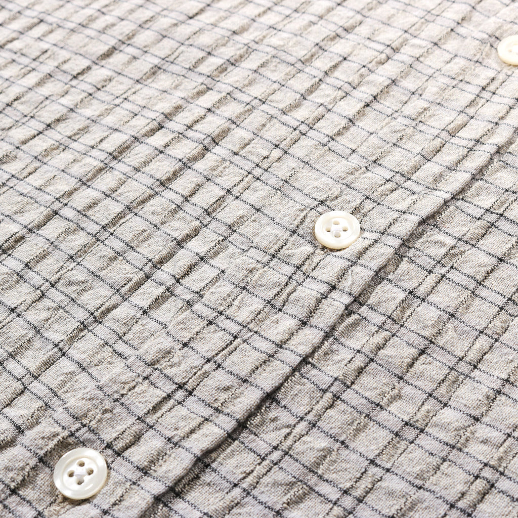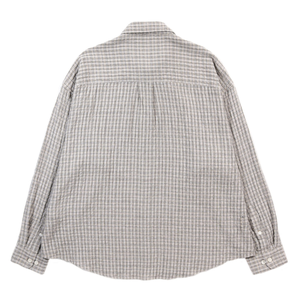 The Button Down Shirt has an oversized fit with drop shoulders and a rounded hem. Featuring button placket, spread collar with buttons, back yoke pleats and raw edged patches at end of both side seams in same fabric. Cut from a viscose cotton blend with a dry hand feel and subtle seersucker texture, in a light grey and black check on a warm grey ground.
