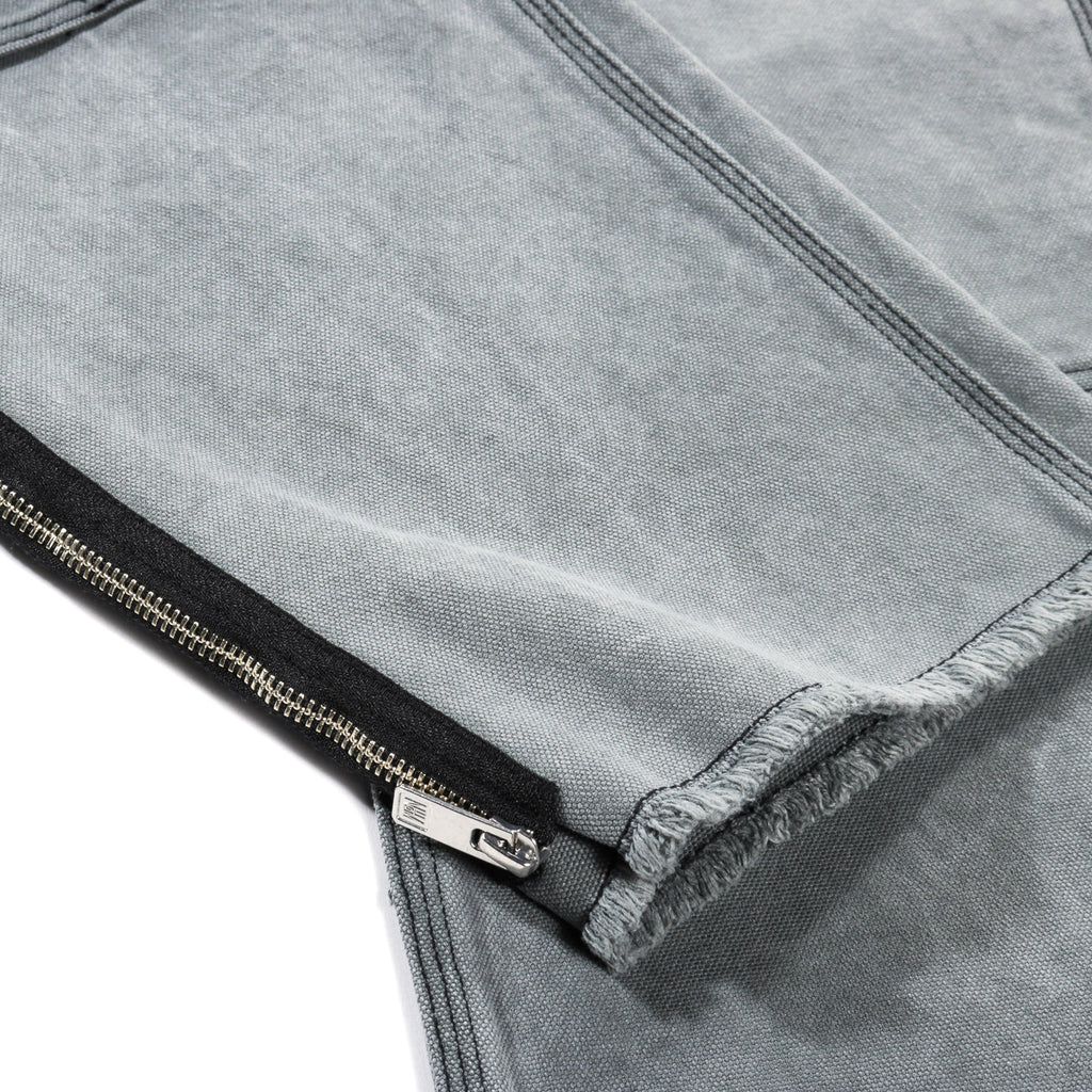 - The cut-off hem includes zippers for adjustable styling